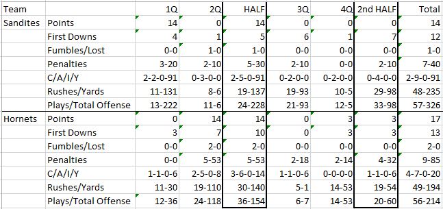 The Sandites emerged to an early 14-0 lead in the first quarter, but then the Hornets dominated the second quarter to tie things up shortly before the half. The rest of the game was a slow mover with lots of defense and very few big plays, and the victor wasn’t decided till there was only 14 seconds left in the game.