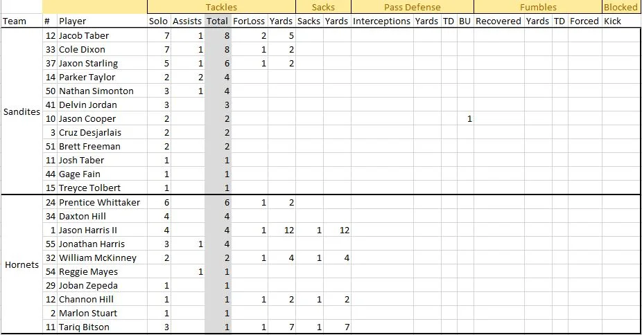 The next Hornet possession fell flat on 4th and 5 at the Sandite 32. Looking to put points on the board, QB Dakari Willis went for the keeper and was brought down at the line of scrimmage by Nathan Simonton and the ball was turned over to the Sandite Offense.